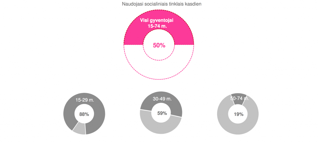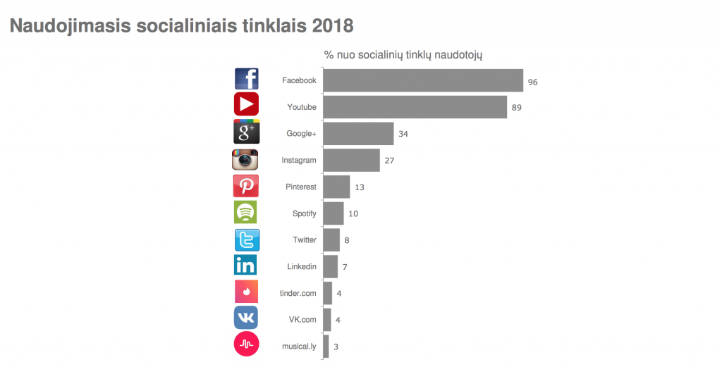 Taigi nuo visų socialinius tinklus Lietuvoje naudojančių žmonių, beveik absoliuti dauguma (96%) naudojasi Facebook’u. Jauni žmonės, žinoma, socialiniuose tinkluose laiką leidžia aktyviausiai: