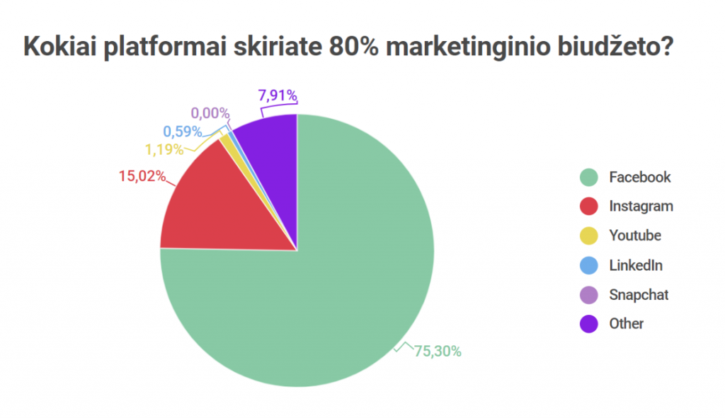 Panašu, kad verslas šiam tinklui irgi skiria didžiausią dėmesį. Unboxed atliktas tyrimas rodo, kad 75% verslo atstovų būtent Facebook tinklui skiria 80% marketingo biudžeto.