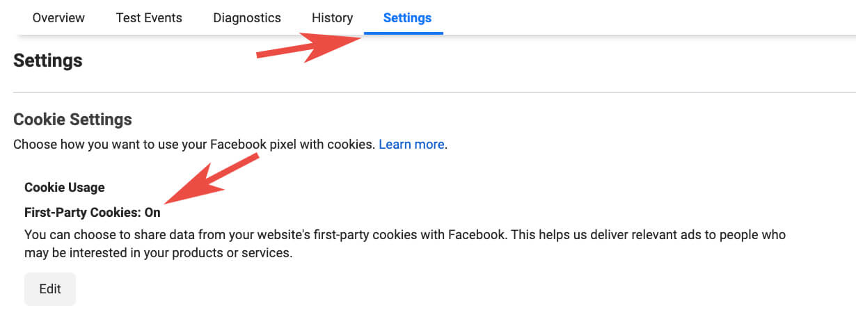 1. Užtikrinti, jog prie pixel’io nustatymų būtų įjungti 1–ųjų šalių slapukai. Tai padaryti galite iš savo Facebook business manager paskyros nuėję į events manager nustatymus arba tiesiog paspaudę ČIA