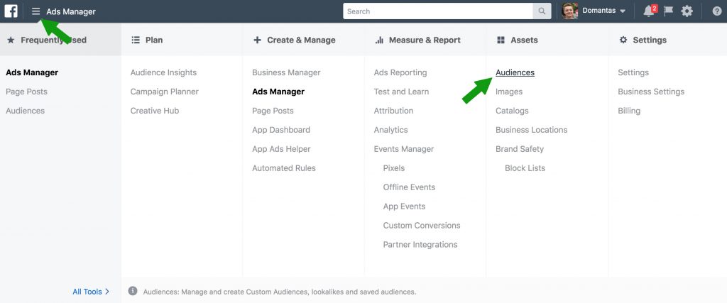 1. Išskleiskite pagrindinį Ads Manager meniu ir ten pasirinkite Audiences.