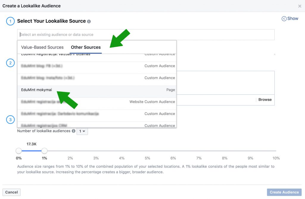 3. Suveskite originaliąją (iš Other Sources skyriaus) auditoriją, į kurią panašią kursite. Tai turi būti sąrašas žmonių, kurie jau parodė susidomėjimą jūsų prekės ženklu, pavyzdžiui jūsų puslapio fanai (iš sąrašo pasirinkite puslapio pavadinimą) arba, jei esate anksčiau sukūrę, jau egzistuojanti Custom auditorija.